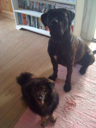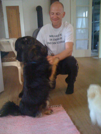 Han er mors hund og især meget glad for mig. Når jeg kommer hjem, hopper og danser han og kommer med en masse gryntelyde. Men der er ingenting med de øvrige i huset. Han kommer også med logrende hale hvis der er kommet besøg. Han virker i det hele taget som en hund med et rigtigt godt sind.