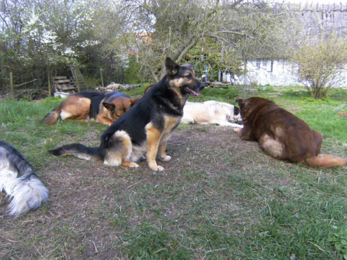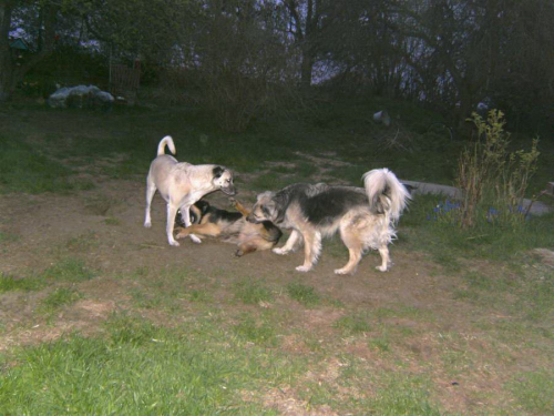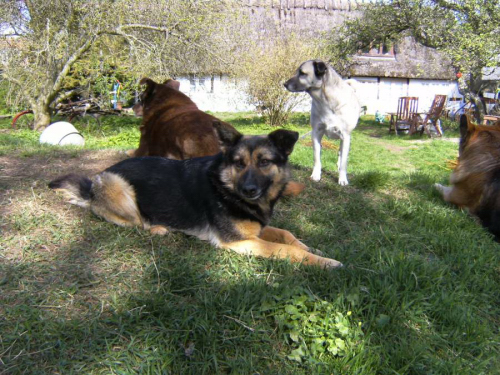 De første 3 uger spiste Olga ca. 3 gange så meget som de andre hundebasser. Hun er vokset, både i størrelse og tykkelse.Hun har mindst taget 5 kilo på og det har pyntet på den lille frøken Olga. Der gik ikke mange dage før hun syntes, det var dejligt at blive kælet for og der midt i sengen var rart at ligge om natten. På den korte tid ,der er gået, har Olga fundet sit jeg frem fra dybet. Hun er lykkelig. Vi kan næsten høre hende råbe jubiiiiiii, når hun kommer styrtende over marken. Den sidste uges tid er hun begyndt at lege meget med Ditte og Susi. Det er helt vidunderligt, at se dem tosse rundt, falde over hinanden og som på et af billederne, bide hinanden kærligt i benene. Hun er faldet så godt til her hos os. Jeg beundrer alle mine andre hunde for, at have taget så godt imod Olga. De har givet hende lov til næsten alt, ja, selv nærmest at tage maden ud af munden på dem. Olga går så fint i snor og lyder sit navn....næsten.Vi er lykkelige for denne skønne, vidunderlige pige.