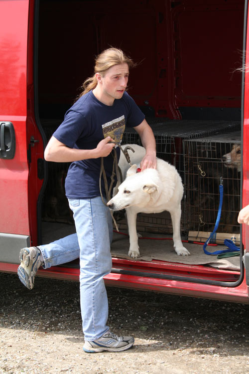 Selvom vi fortalte at man skulle holde lidt afstand fra bilen når der blev åbnet op for de små pus, så kunne ingen rigtig dy sig at træde nærmere men det gik rigtig fint det hele - Bartek, vores chauffør, stod for udslusningen af hundene, først kom Bialy Mis, den hvide bjørn - og som vi alle havde forventet er han en ligeså smuk hund som på alle de billeder vi har set af ham. Pia overtog ham hurtigt og trådte væk så Kiri og Mickey kunne komme ud - Bartek kom vist til at stå at blomstre lidt med Kiri i favnen, for hendes ejere var der ikke - der var 2 af hundene som blev kørt helt til dørs af Gadehunde; efter aftale.