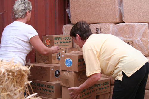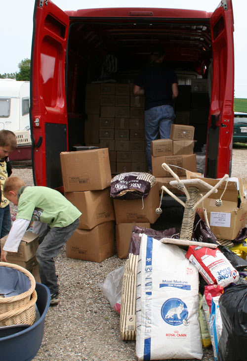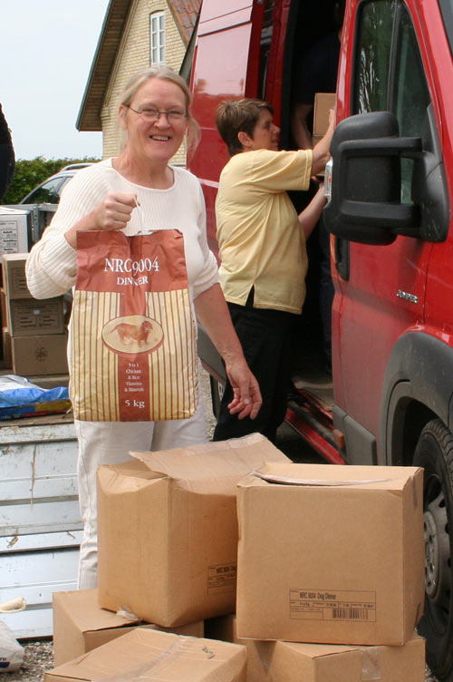 Da alle hunde var kommet ud af bilen kunne Bartek lige få lov at strække ud og vi fik en snik snak på vores bedste engelsk - bagefter gik vi igang med at læsse bilen med alt det donerede foder fra Novafoods - hele 1200 kilo samt en masse goe foderskåle og tyggeben som Jette fra horsens havde indsamlet via familien. Også Bente og veninde Connie var der med 90 kilo doneret foder fra "Lundemølle" Fuglebjerg - tusind tak til dem! Der var 3 printere og en skanner der også skulle sendes med plus diverse hundesenge og andet. Alt i alt har der vel været omkring 14-1500 kilo foder til internatet - virkelig flotte bidrag må vi sige, vi er SÅ overraskede over alle de bidrag vi får ind til hundene og de får gavn af det HELE.