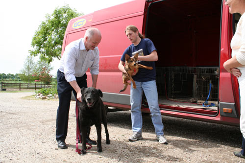 Den tirsdag var der mange spændte folk som ventede på sin nye hund fra Polen. 3 styks folk fra Gadehundes bestyrelse + hjælpere mødte op hos hjemkomstvært Liselottes hestegård i Tureby. Lidt efter lidt dukkede de forskellige hundeforældre op, som skulle hente deres hunde. Vi gjorde klar til at modtage 8 hunde, som havde været undervejs i 17 timer fra Warszawa. Vi forventede nogle for det første meget trætte hunde, men vi frygtede også at de måske var stressede og meget bange, hvilket det skulle vise sig de ikke var - jo der var lige nogle få der var lidt forsigtige i deres fremfærd, men ellers var alle hunde i fin form, lige på nær lille Mikkel som var meget træææt.