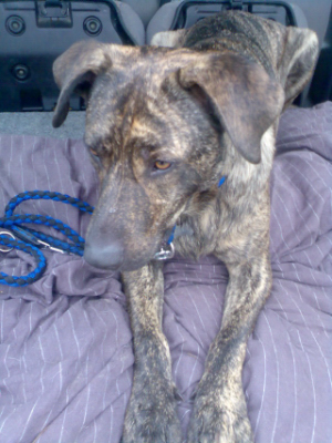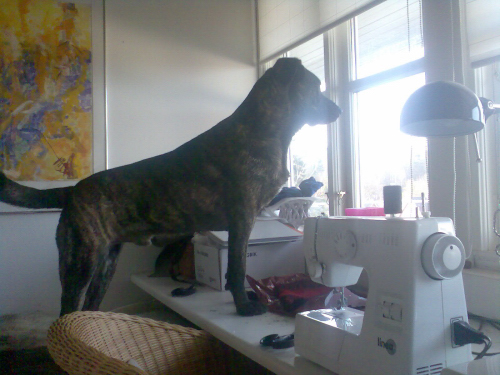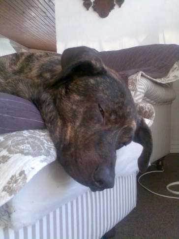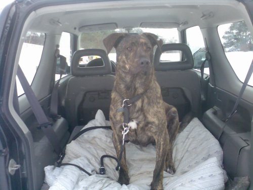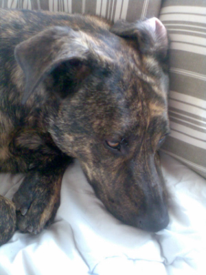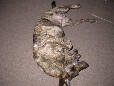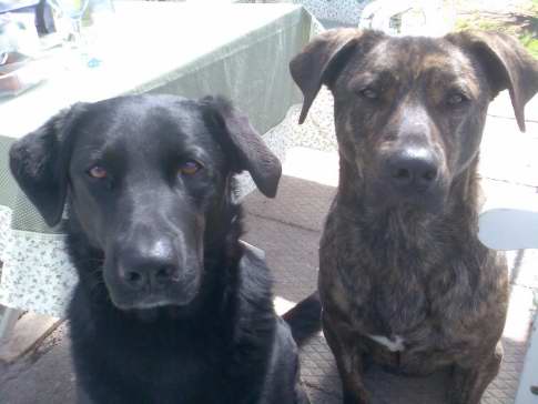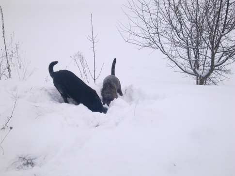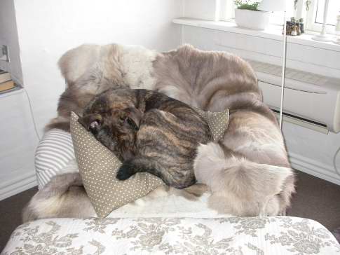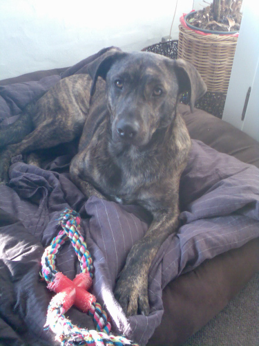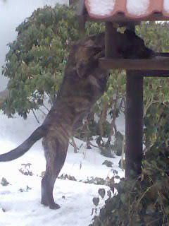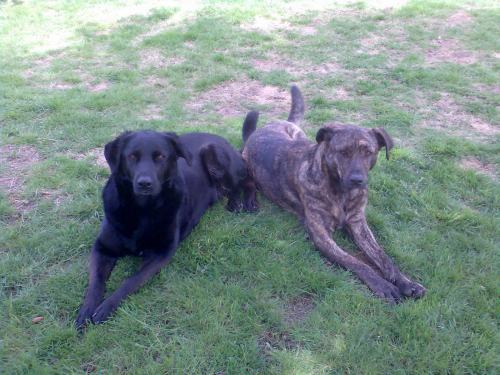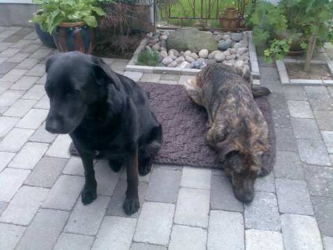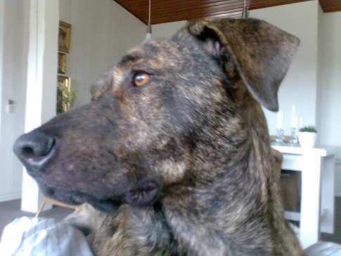 (Julle) bliver mere og mere glad for ham, hun har altid virket lidt mut og trist, men det har han formået, med al sin glæde og iver, at rette op på!Nu er hun livet op og leger med ham, han driller hende og det kan hun godt li', hun vejer to kilo mere end ham, så hun har overtaget når de "nedlægger"hinanden. Han er begyndt at løbe løs når jeg lufter dem, og han er så dygtig til at komme når der bliver kaldt, bortset fra når Musvågen tillader sig at flyve lige hen over hans mark, så skal den bare forfølges, og lige dér har han vat i ørerne;-) Musehuller er noget af det bedste han og Finken ved. De kan grave og grave i halve timer og flere gange har han være u-heldig at grave en rede frem så musene løber om benene på mig og de to ser dem slet ikke, for de har hele hovedet nede i jorden, så er det bare med at få hevet rovdyrene væk, så de små mus kan komme tilbage i deres huller ! Finken sladre når Tigeren laver noget han ikke må, så kommer hun farende og gør voldsomt "han laver noget", og så må jeg af sted for se hvad han laver."Må jeg ikke det, mor ?" og med sine dejlige vippeører og smukke øjne, har man helt tilgivet ham. Vores voksne søn, som hentede Tigerdyret i Randers, er helt fortabt i ham, han har næsten taget ham fra mig :( De er tit på stranden, og den anden dag, da det var tøvejr, skulle Tigeren ud på isen som han plejede, ............ og den knak, og hvad var nu det for noget, op på isen igen og den knak atter, det var for meget for Tigerdyret, så skulle der bides i det mærkelige hvide noget som var så salt, men så var der jo vand nedenunder og han er vild med vand. Han elsker at kæle og blive nusset med, er dygtig til at "lægge sig", "plads"og "bliv" osv. når vi giver ham kommandoer, det der med at hoppe op af folk, er MEGET svær at huske, "ved godt mor, men jeg er så glad". Vi har holdt en pause i træning, dels pga vejret og dels pga jeg skal have nyt knæ. Så der går en rum tid før vi kan starte igen, - han elsker det :-) Det var lidt om livet her på bakken med vand på den ene side og mark/skov på den anden side, og Tigeren i midten ;-) Hilse til Jer alle gode hundemennesker