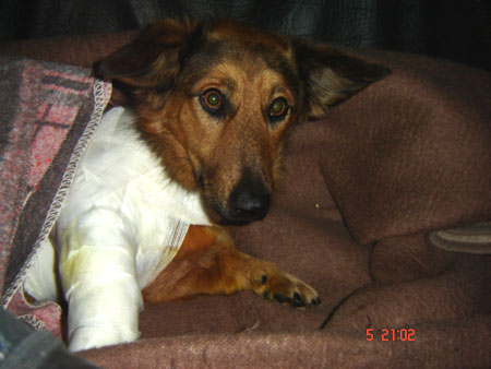 Stakkels Kasper er blevet påkørt af en bil og brækket sit højre forben. Han er blevet opereret da brudet var kompliceret og har nu gibs og bandager på. Han får medicin og ligger på klinikken endnu. Om en uges tid skal dyrlægen lige tjekke op på ham og tage nogle blodprøver. Når han er klar kan han komme hen på hundehotel og fortsætte sin rekreation. Det kostede 1.200 kr for selve operationen og ca 400 kr i medicin. Der kommer yderligere udgifter, når han skal hen på hundehotellet, men det tager vi når det kommer. Vi håber på god respons og om der er nogen der vil hjælpe lidt til i sygekassen.