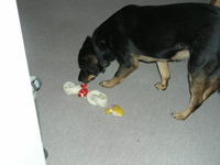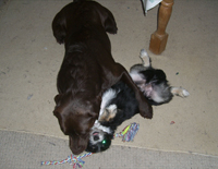 Nu er hun livet op og leger med ham, han driller hende og det kan hun godt li', hun vejer to kilo mere end ham, så hun har overtaget når de "nedlægger"hinanden.