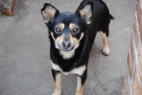 Hun vejer 5 kg og er omkring 8 måneder gammel. Humøret er højt hos den lille hund, som elsker at der sker noget og som er nem at lokke med godbidder.