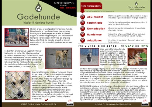 Man er velkommen til at kopiere denne tekst og bruge den i en mail: "Kære alle Jeg er tilfældigvis stødt på en ny forening, der har til formål at hjælpe gadehunde, som er indfanget og kommet på internat i Polen. Foreningen har en hjemmeside www.gadehunde.dk hvor I kan læse mere, hvis det har interesse. Formålet med foreningen er at hjælpe disse stakkels dyr - dels ved at forsøge at få hundene adopteret til et hjem og dels ved at indsamle tæpper, hundelegetøj m.v. til at forsøde tilværelsen for hundene, mens de stadig bor på internatet. Det er også muligt at støtte foreningen økonomisk - enten ved medlemskab (100 kr. årligt) eller ved at blive sponsor for en bestemt hund. En del af hundene har stærkt brug for at komme på "hundehotel" og/eller dyrlægehjælp, så det skaffes der penge til via sponsorater. Der er ingen "mindstepris" for disse donationer. Man har også mulighed for at donere ting til salg via hjemmesiden, hvor overskuddet så går til foreningen, eller hjælpe med at udbrede kendskabet til foreningen ved at sætte flyers op i supermarkeder, biblioteker m.v. (der er fortrykte flyers til brug herfor på hjemmesiden, som man bare skal printe ud). Du er også meget velkommen til at videresende denne mail, hvis du mener at kende nogen, som kunne være interesseret i at hjælpe. Foreningen drives af nogle danske piger, som selv kører til Polen og afleverer tæpper m.v. og tager de hunde med hjem, som har været så heldige at få en familie. Efter at have surfet lidt på hjemmesiden er jeg ikke i tvivl om, at der er ægte intentioner bag foreningen, og at pengene/tingene kommer de rigtige steder hen.